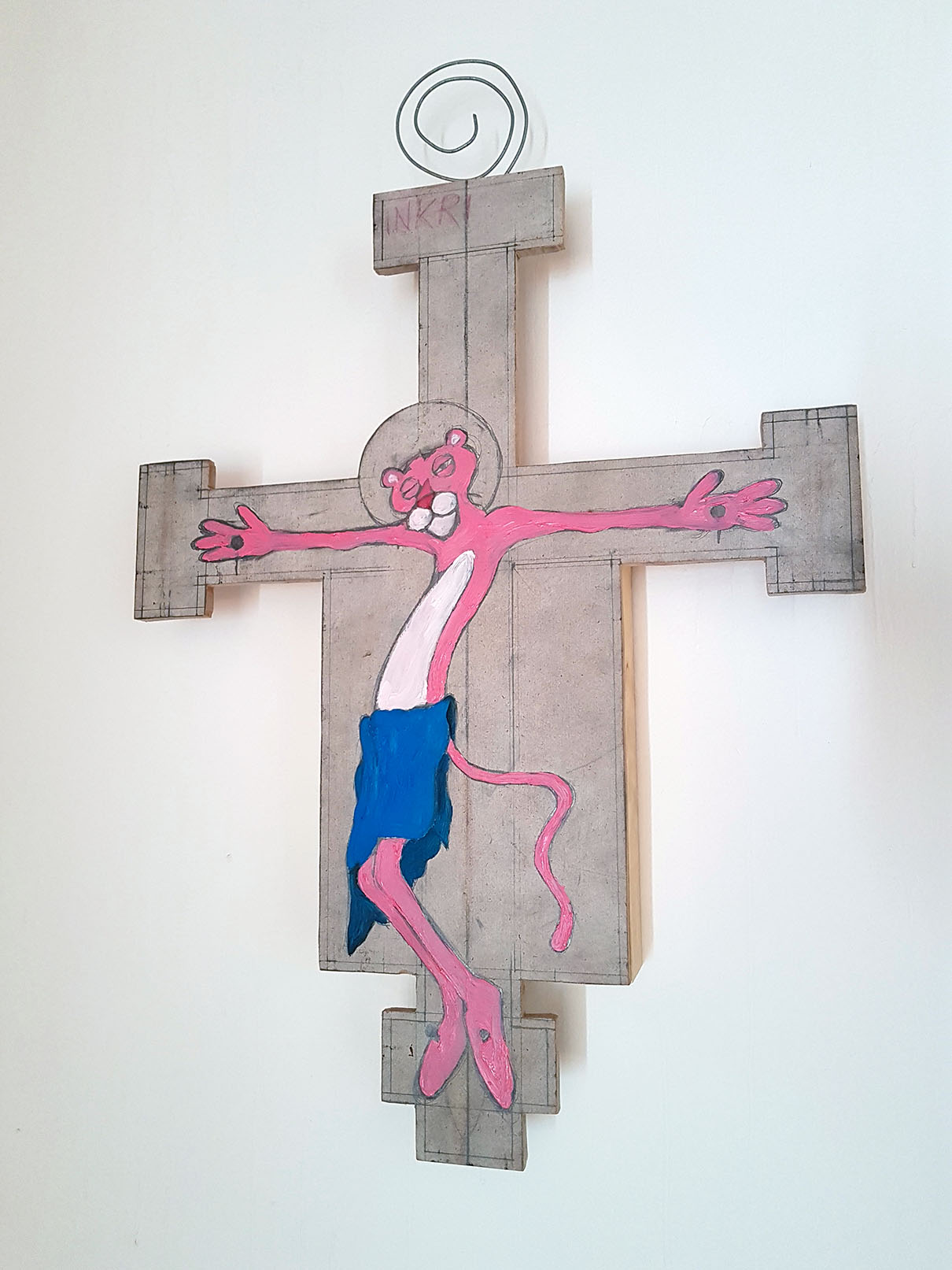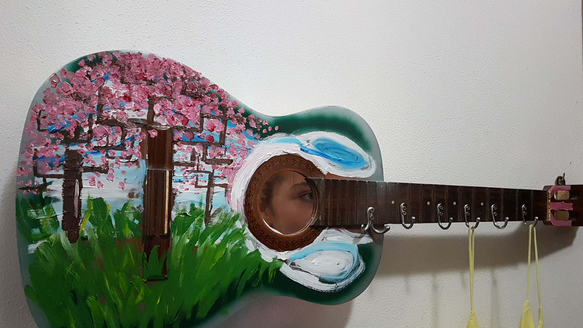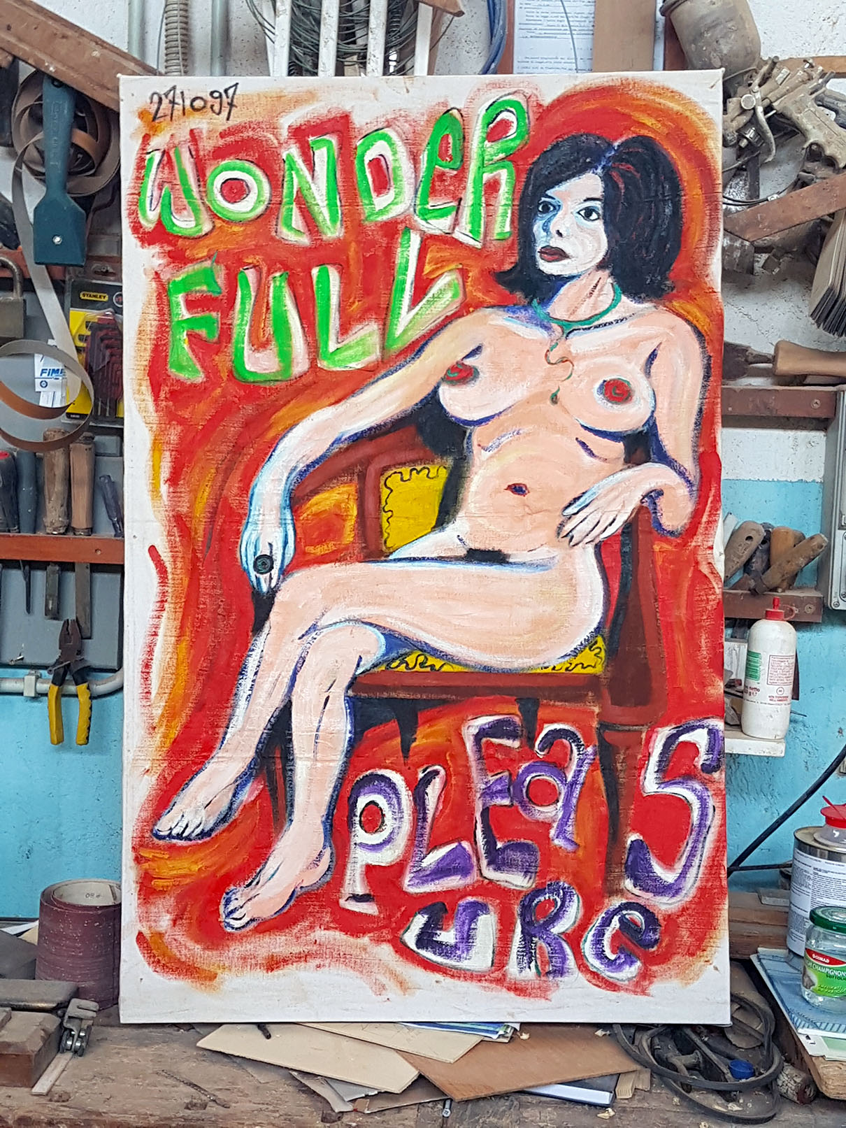 Una chitarra diventa un attaccapanni che lui battezza Sogno di Primavera, un bancale si trasforma in una libreria dipinta con la tecnica dell’action painting.